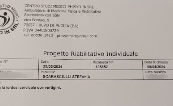Esperienza negativa: Non centro fisioterapico ma centro spilla-soldi Mi sono recata presso di loro per eseguire una visita fisiatrica in convenzione. La "visita" è stata inesistente, il "medico" molto superficiale e sbrigativo, non mi ha nemmeno guardata, a mala pena ha guardato l'ultima radiografia mentre ha totalmente ignorato tutte le vecchie radiografie. Mi ha chiesto quale fosse il problema, non mi ha neanche lasciato finire di parlare, gli è bastato sentire la parola "vertigini" (che mi capitano, sì, ma con frequenza scarsa), ha preso la radiografia dicendo che "sì, il collo è rigido quindi le vertigini dipendono dalla cervicale, ti prescrivo un po' di fisioterapia", pensando che con fisioterapia intendesse esercizi per ristabilire la curva cervicale, accetto salvo poi scoprire dal segretario che la "fisioterapia" è in realtà una massoterapia+tecarterapia; comunque accetto perché sento di avere delle contratture alla spalla e penso mi possa fare bene. La visita è così sbrigativa e annichilente che non riesco nemmeno a chiedere al "medico" delucidazioni sulla spondiloartrosi, il motivo principale per cui avevo in realtà deciso di fare la visita. Comunque, attendo per il trattamento nella speranza di trovare un* brav* fisioterapista; mi aspettavo che alla fisioterapista fosse stata comunicata la mia condizione, invece anche lei mi chiede perché sono lì. Tecar ok, non avendola mai fatta non so giudicare; massaggio indecente, praticamente l'equivalente dello spalmare la crema solare. Quando torno a casa, riguardo il referto della radiografia e scopro che invece la mia curva cervicale è in perfette condizioni! Quindi non solo la visita è stata sbrigativa ma anche fasulla: il "medico" mi ha fatto una diagnosi errata solo per potermi prescrivere poi un trattamento non mutuabile per la bellezza di €60 a seduta!!!! Evitate assolutamente, con la salute non si scherza.